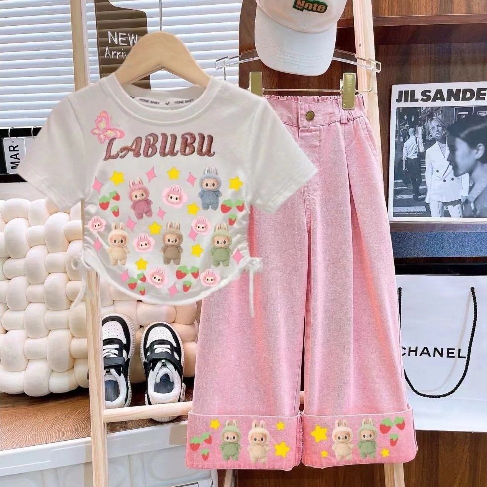 Girls’ Summer Outfit LaBubu 2025 New Fashionable Children’s Short Sleeve Denim Pants Trendy Two-Piece Set